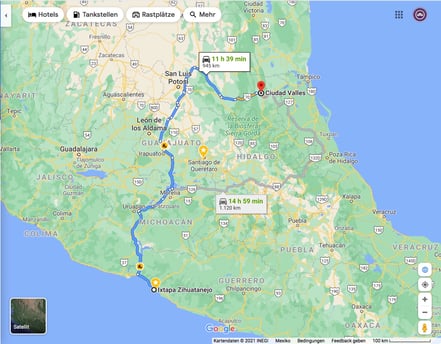 Es ging also los im Süden, vom kleinen Örtchen Ixtapa. Hier wohne ich aktuell. Die Route führt über Mexiko City, dann weiter nördlich Richtung San Luis Potosí. Das ist erstmal ingesamt eine Reise von ca. 24 Stunden in Bussen mit einigen Umstieg-Mannövern. Alles machbar aber irgendwie schon ein Road Trip.