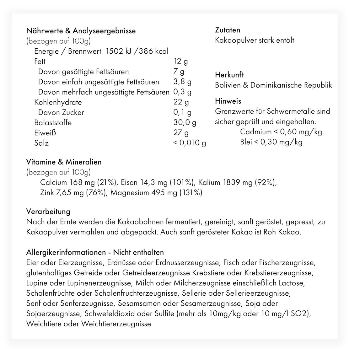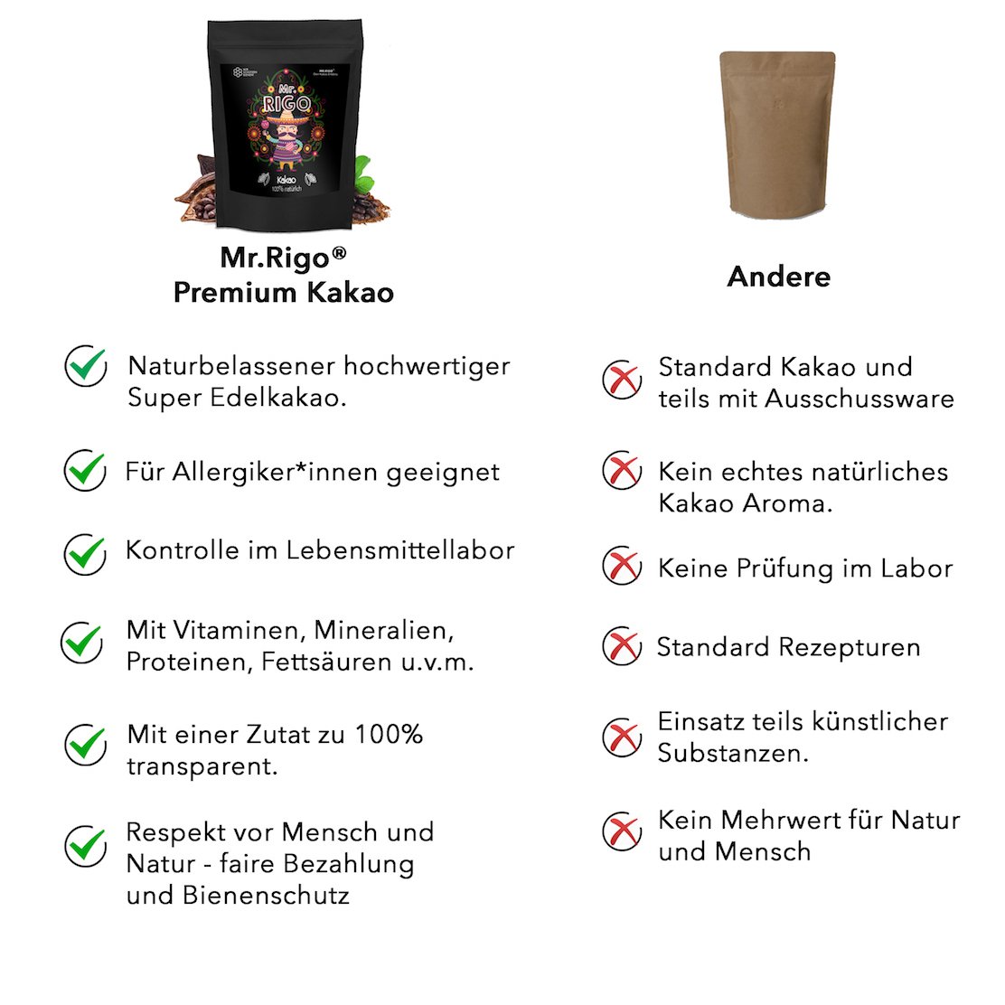 Mr. Rigo Kakao hat mit 10-12% einen sehr niedrigen Fettanteil und die Cadmium Werte liegen aufgrund der hervorragenden Qualität unter < 0,60 mg/kg