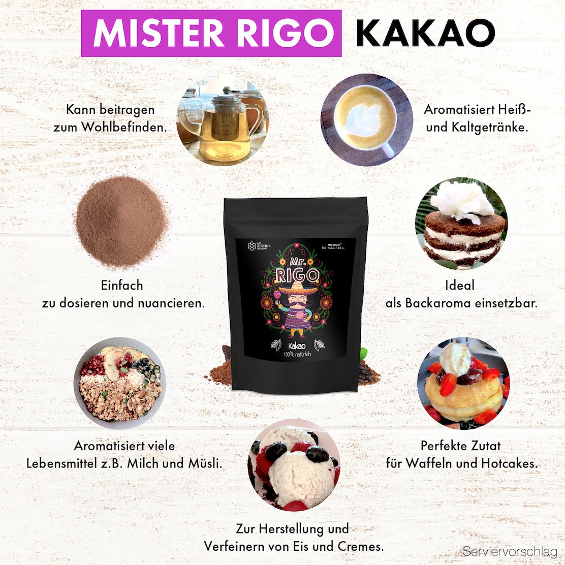 Verwendet werden kann unser Kakaopulver für vielerlei Dinge. Als Topping für Hotcakes, ebenso für Eis oder Pudding aber auch um wundervoll leckeres Vanillegebäck wie Kuchen, Torten oder Kekse zu backen. Er eignet sich daher gleichermaßen für Hobbybäcker*innen und Chefköche zum Zubereiten von Kakao Kreationen zuHause, in der Küche oder im 5 Sterne Restaurant.