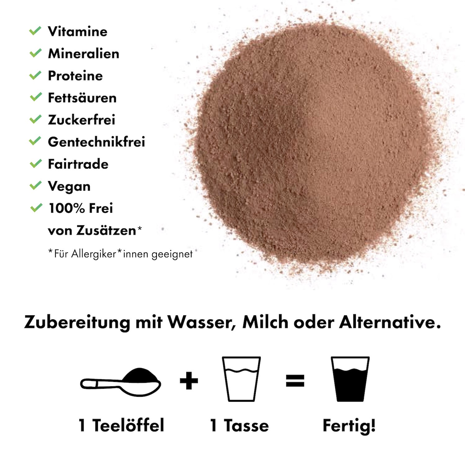 Der sehr fein gemahlene Kakao löst sich nach 4-5 Minuten gut in der Flüssigkeit auf. Es kann dabei vorkommen, dass dieser leicht klumpt. Das ist aber ein gutes Zeichen. Denn Kakao der sich sofort in der Flüssigkeit auflösen würde enthält in der Regel sehr wahrscheinlich Zusatzstoffe wie Zucker oder andere Mittelchen.