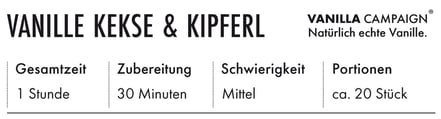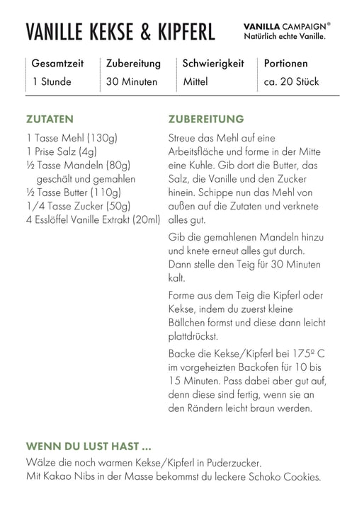 Backe die Kekse/Kipferl bei 175º C im vorgeheizten Backofen für 10 bis 15 Minuten. Pass dabei aber gut auf, denn diese sind fertig, wenn sie an den Rändern leicht