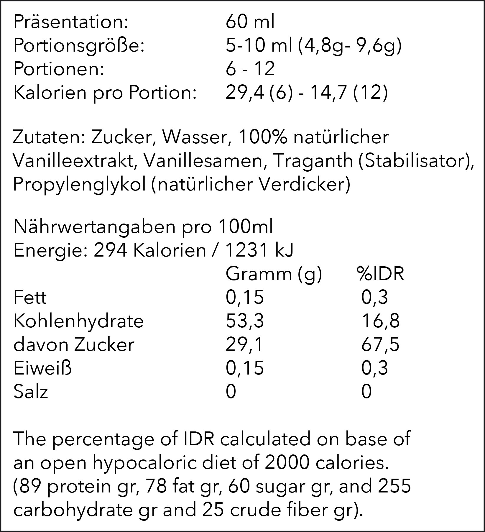 Wasser, Zucker, Extrakt aus Vanilleschoten, Vanillesamen, Traganth (natürlicher Verdicker auf Pflanzenbasis), Propylenglykol (Stabilisator)