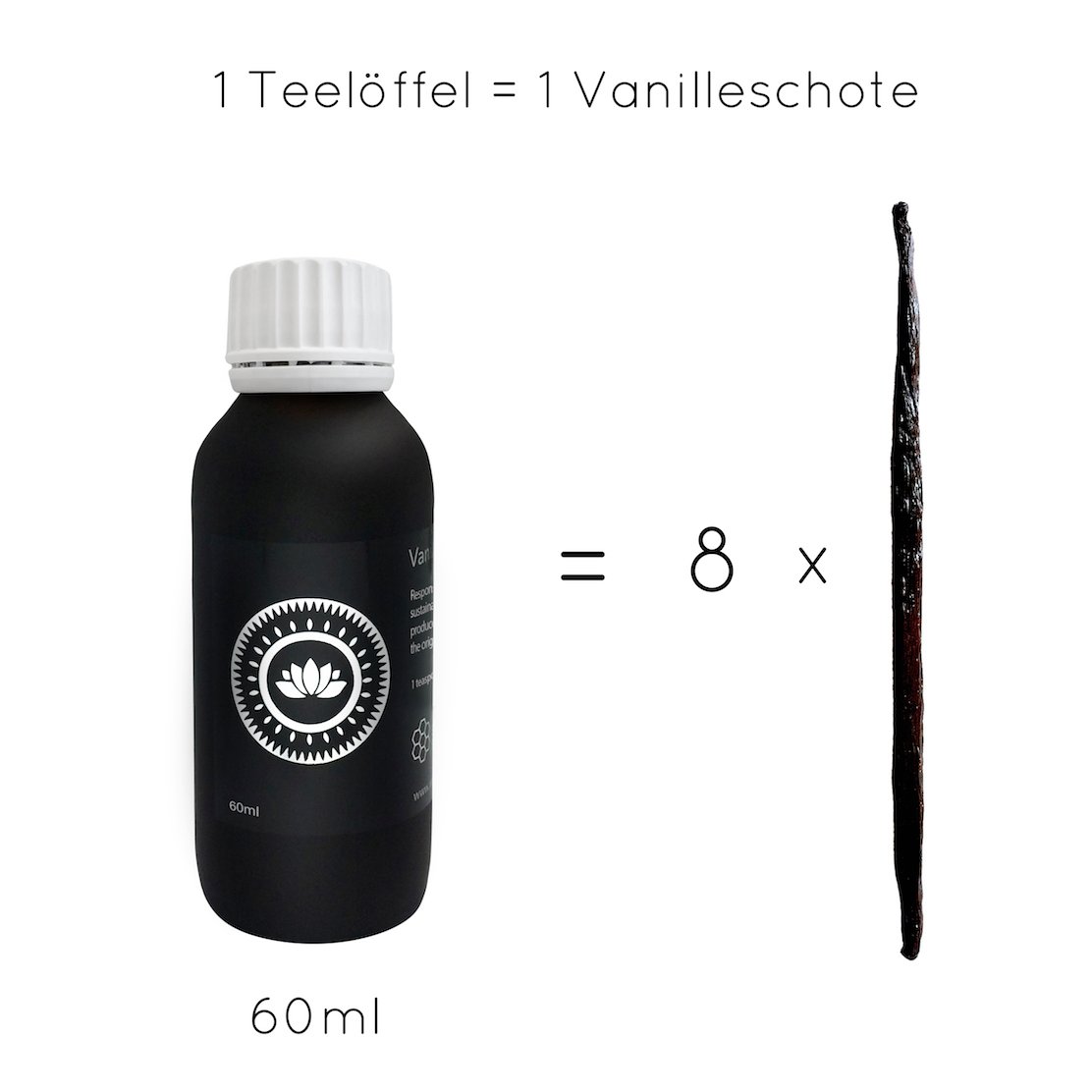 60 ml entspricht der Menge von ca. 7-8 üblichen Vanilleschoten mit einer Länge von ca. 12-14 cm.