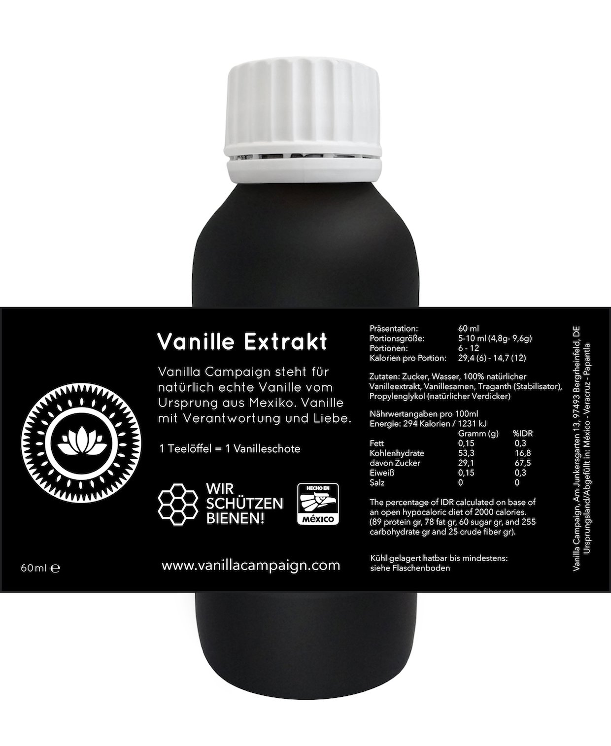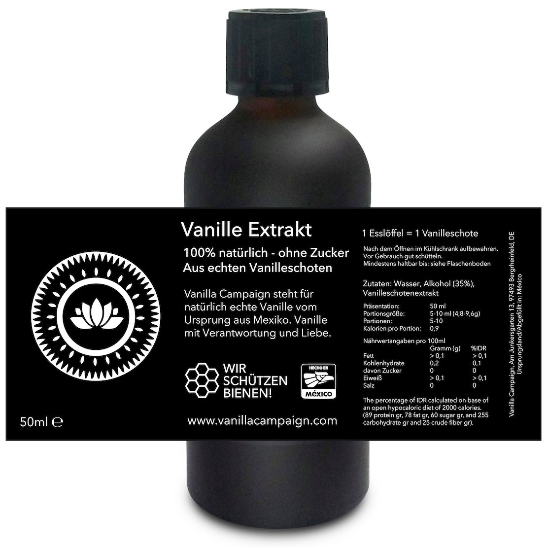 gewonnen, ist zu 100% natürlich und enthält kein künstliches Vanillearoma. Vanilla Campaign fördert Bienenschutz, nachhaltigen Anbau und faire Bezahlung direkt in der Anbauregion.